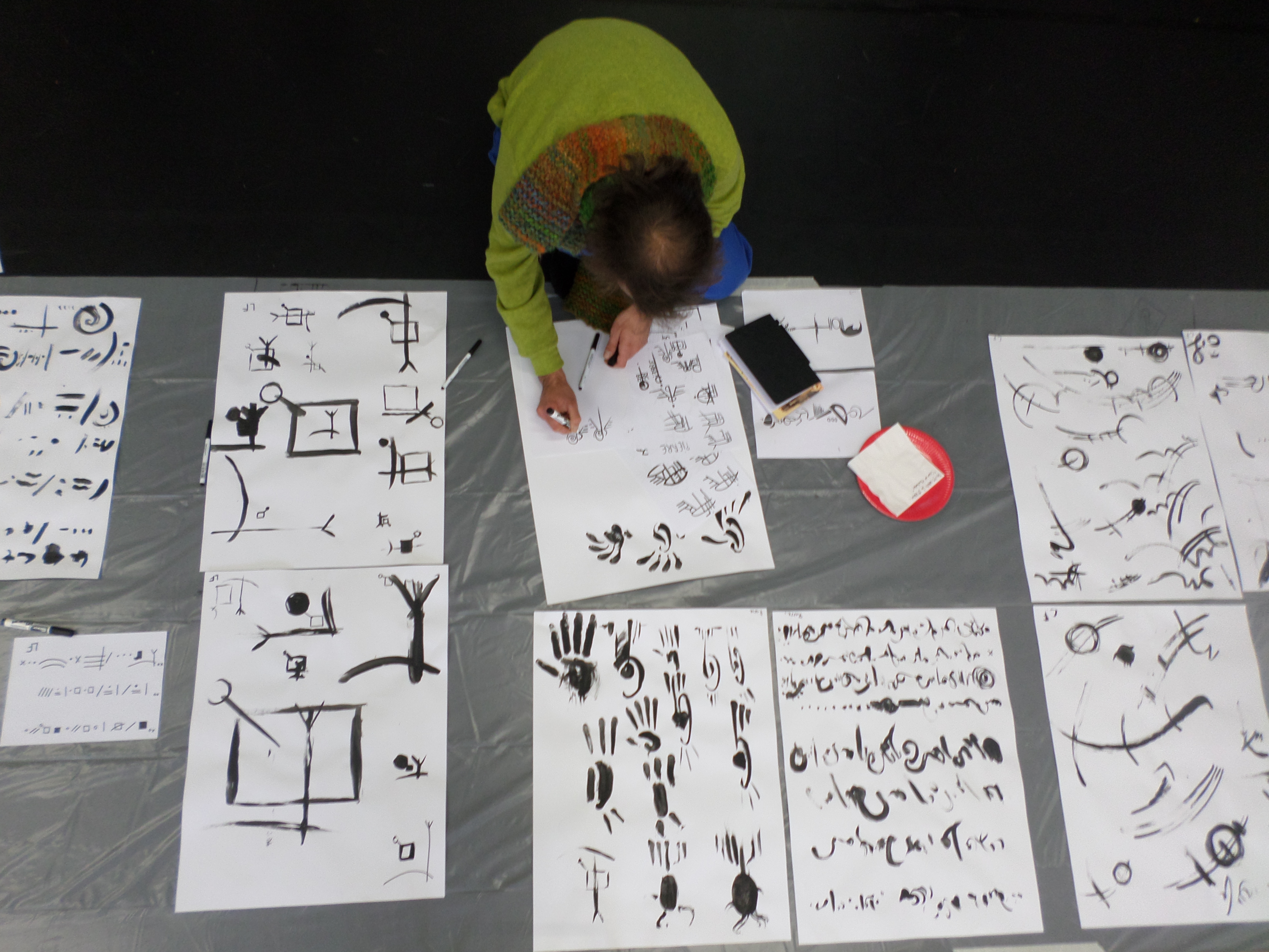 Dans la salle de travail devenue atelier d’images, J.M. les conduit à libérer le trait pour faire paraître un signe dans lequel ils se reconnaissent. Pour nourrir leur geste, ils ont apporté des images, des bribes de textes, des objets. Ils tentent de se mettre au jour à travers les lettres gravées de leur propre prénom qui d’énigme devient poinçon, signature. Le trait d’encre devient leur empreinte de soleil sur la page.